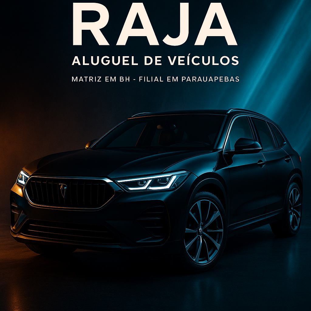 Criar uma imagem premium de campanha para a Aurora IA da plataforma ricardoiaoficial.com, com estética futurista, forte impacto visual, aparência publicitária de alto nível, beleza marcante, tecnologia elegante, luxo digital, composição cinematográfica, profundidade, iluminação bonita, alto contraste, refinamento premium e sensação visual encantadora. Contexto do pedido do usuário: Gere a mesma imagem e coloque o nome da Raja Aluguel de Veículos com matriz em BH e Filial em Parauapebas no para
