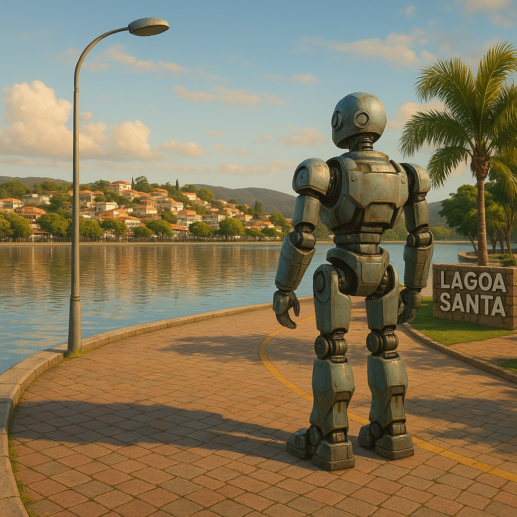 crie uma imagem de um robo na orla da lagoa em lagoa santa MG