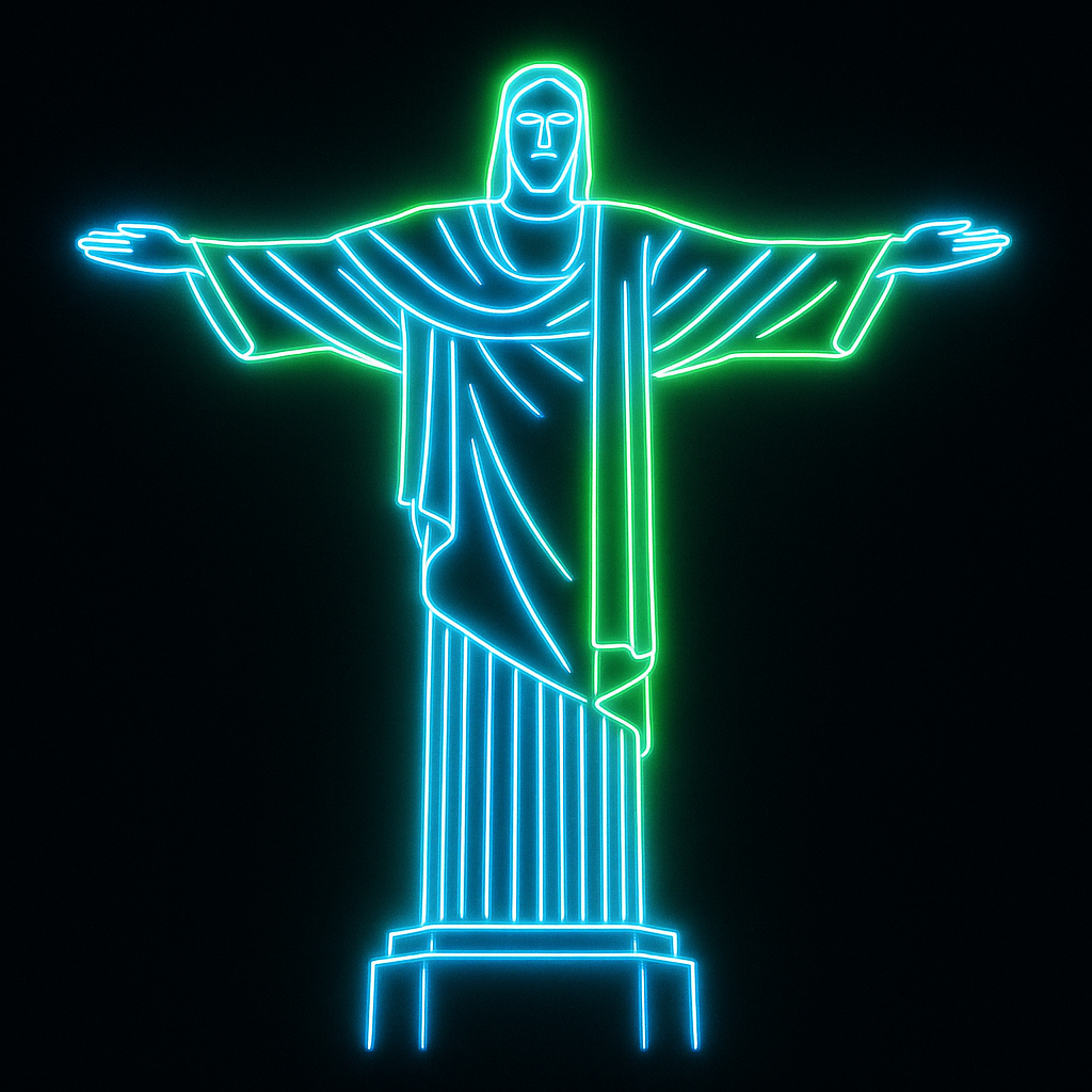 Gerw uma imagem do crieto redentor com travos em azul neon sobreposto por verde neon